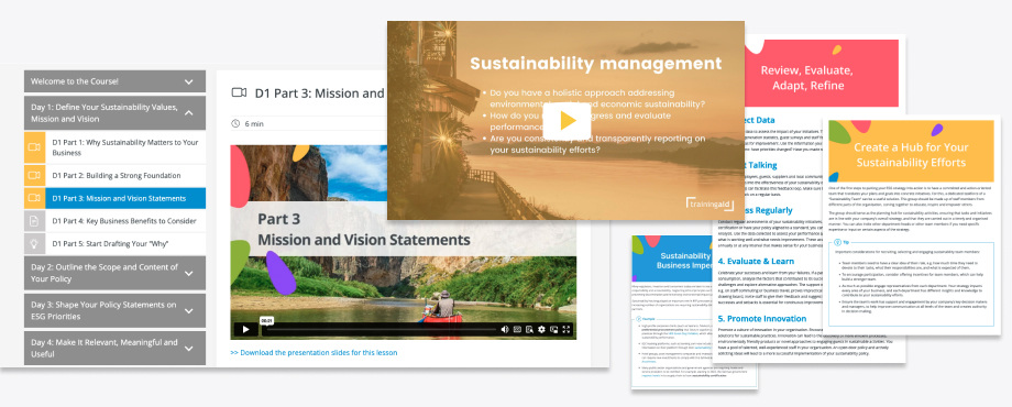 Overview Schedule Syllabus Contributors Overview Get started on concrete steps to establishing your sustainability policy and strategy If you've worked on sustainability award or certification processes, or been part of any framework following sustainability standards, you've come across requirements for a sustainability policy. Having a clearly defined sustainability policy (and importantly - having it implemented) is often one of the main, and even first, criteria for many such processes. Not sure if your business meet such requirements? Need guidance on getting started? Then this self-guided online course is for you! Explore key concepts, best practices, and practical insights that will help enhance your company's sustainability performance. Your sustainability policy will be a critical element of your overall approach to sustainability management and ESG (Environmental, Social and Governance) commitments. Get started now on building a solid understanding of the what, why and how of developing and implementing an effective sustainability policy. Learning Objectives This course will strengthen your knowledge and guide your work on: Getting started with an outline of your sustainability policy. Articulating your core values and purpose to guide your commitment. Identifying your ESG (Environmental, Social, Governance) priorities. Ensuring your policy is relevant to your business and stakeholders. Designing and implementing your policy as a useful living document. Key Outcomes Following the lessons and instructions in this course, you will take concrete steps in building: A solid foundation: Your sustainability policy will serve as a guidance document, outlining your sustainability commitments and providing a consistent framework for how you will incorporate environmental, social and ethical considerations into your organisation. An engagement and communication tool: Your sustainability policy should serve both as an internal guide and an external communication and engagement tool. As such, the development and delivery of your policy should reflect your internal and external stakeholder relations. A living policy document: The key to having a sustainability policy that works for you is actually implementing your policy, not just writing and publishing one. The words in your policy must be turned into actionable, measurable and concrete responsibilities. Schedule Dates Length Type Format Language Price Register Dates: 3 - 5 hrs Online On Demand English 35,00 € Register Course ID: TA-SPS-TO Length: 3 - 5 hrs Type:Online Format: On Demand Trainers and Contributors: Ayako Ezaki, Nia Klatte Language: English Price:35,00 € Register Enough spaces available Don't wait too long Fully booked Training already confirmed Syllabus 30 minutes per day, 5 days. Each of the five modules of this course takes half an hour to complete. With a short and focused learning session each day (for example during your break, or on your daily commute), you can finish the course just in one work week. Each module contains three sections: WATCH: Review the video lesson on key topics READ: Learn more from real-life examples DO: Apply your knowledge to your own policy Day 1: Your Sustainability Values, Mission and Vision Starting with the question why having a sustainability policy can support your business, in this module you will learn how the process of developing, implementing and using your sustainability policy will benefit your business. You will also start working on articulating your core values and purpose, which will form the basis for creating a policy that is relevant and impactful. Day 2: Outline the Scope and Content of Your Policy Building on the core values you’ve identified, in this module you will focus on what your sustainability policy actually is, and work on defining what should be covered in it and how you will apply it. Your work on outlining the scope and content of your policy will support the steps you need for creating a policy that serves as a useful tool for your business. Day 3: Shape Your Policy Statements on ESG Priorities A key approach you need for crafting an impactful policy is prioritising. In this module you will reflect on the conditions and functions within your company that will affect the implementation of your policy, and work on your policy statements - the essence of your sustainability policy - addressing key Environmental, Social and Governance focus areas. Day 4: Make It Relevant, Meaningful and Useful For your policy to be effective in inspiring commitment and action, it needs to connect with its intended audiences in a meaningful and relevant way. In this module, you will work on finding the right tone of voice for your policy, and preparing for how you will turn your policy into a useful stakeholder engagement and communication tool. Day 5: Assign Actionable, Measurable and Concrete Responsibilities To make sure your sustainability policy is a living document, you need to turn the words in your policy into actionable, measurable and concrete responsibilities. In this module, you will work on identifying and defining key approaches to developing the next steps on your journey to becoming a more responsible business, with action plans and targets. TrainingAid Learning Platform Our learning platform is designed to optimise learner experience, with the specific needs and contexts of tourism industry professionals in mind. Through our global network of partners and collaborators, TrainingAid has been offering practical and accessible opportunities for tourism professionals, helping build skills for sustainable solutions. We apply our technical expertise and practical experiences to design and develop the best learning experience our learners. To learn more about our approach to training, read our learner guide. Questions? We Are Here To Help Email Ferdinand Weps with your questions or to schedule a call. Facilitators and Contributors Nia Klatte Head of Sustainability &