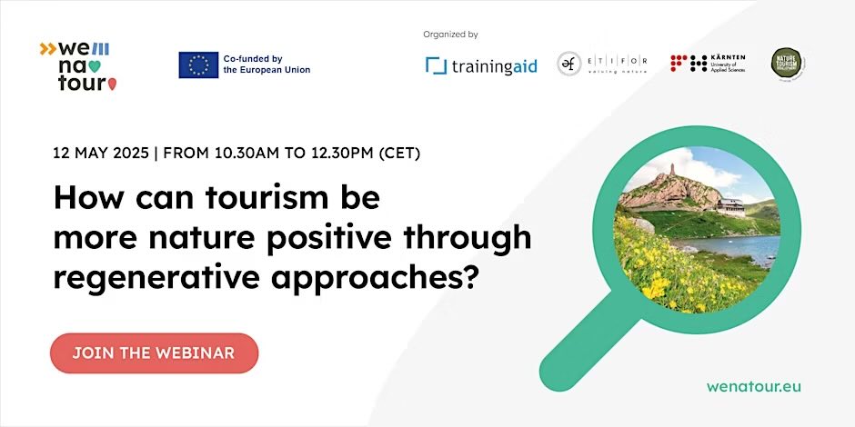 How can tourism be more nature positive through regenerative approaches? Join our fourth webinar to explore how tourism can become nature-positive through regenerative practices. Learn how tourism impacts local ecosystems and discover strategies to minimize environmental footprints while enhancing natural resources. Gain insights into sustainable tourism practices that support ecological restoration and positive outcomes for destinations. TrainingAid Expert Team at TrainingAid Published: March 15, 2025 TrainingAid NewsDestination StewardshipDestination Management Date: Mon, 12 May 2025 Time: 10:30 - 12:30 CEST Location: Online Webinar WeNaTour Project: Sustainable Tourism Destination Management Webinar Series (4/4) > Register now to secure your spot! Our final webinar in the series will explore how tourism can become more nature-positive through regenerative approaches. Destinations rely on healthy ecosystems to deliver meaningful travel experiences, but tourism can also have significant impacts on the environment. This session will delve into the relationship between tourism and nature, focusing on how to manage tourism’s environmental footprint while leveraging regenerative tourism to create positive outcomes for local ecosystems. Attendees will gain valuable insights into sustainable practices and strategies for restoring and enhancing natural resources through tourism. This webinar is part of a 4-part webinar series open to the public. Why You Should Attend This exclusive webinar is designed for tourism professionals, government officials, business owners, and anyone passionate about sustainable tourism. By attending, you will: ✔ Gain insights into how regenerative tourism can restore and preserve ecosystems. ✔ Learn practical strategies for reducing tourism’s environmental footprint. ✔ Discover how tourism can contribute to nature-positive outcomes for local communities. ✔ Engage with industry experts and network with like-minded professionals. Speakers Ayako Ezaki, TrainingAid (moderator) Federica Bosco, Etifor | Valuing Nature Lilia Schmalzl, Carinthia University of Applied Sciences Simon Collier, Nature Tourism Development Reserve Your Spot Today! Don’t miss this opportunity to learn from industry leaders and take actionable steps toward more sustainable destination management. > Register now to secure your spot! Once registered, you will receive two emails: Confirmation email – immediately after registration. Reminder email – sent shortly before the webinar as a prompt. We recommend checking your spam folder if you do not receive these emails. The link to the Zoom live event will be sent some days after the registration. This webinar is part of a 4-part webinar series Webinar 1: What Makes a DMO Effective in Sustainable Destination Management? (April 9th, 2025) Webinar 2: How can destinations measure and optimise tourism’s socio-economic impact (April 26th, 2025) Webinar 3: What does cultural sustainability mean for destinations and communities? (May 7th, 2025) Webinar 4: How can tourism be more nature positive through regenerative approaches? (May, 12th 2025) About WeNaTour WeNaTour is a three-year European initiative, funded by the Erasmus+ program, designed to train the next generation of sustainable tourism professionals. Through cutting-edge insights, best practices, and expert-led discussions, our program prepares individuals to drive positive change in tourism destinations worldwide. To give you a taste of the WeNaTour experience, we are opening up a 4-part webinar series to the public. This is a unique opportunity to gain valuable knowledge, connect with industry experts, and explore if the WeNaTour Sustainable Tourism Course is right for you! For more info visit https://wenatour.eu/learn/ TrainingAid NewsDestination StewardshipDestination Management Share this