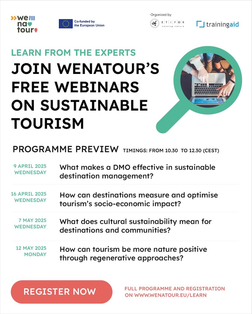 What Makes a DMO Effective in Sustainable Destination Management? Join our first webinar to explore Destination Management Organizations (DMOs), their structure, and key responsibilities. Learn best practices for sustainable management, stakeholder collaboration, and destination stewardship through real-world examples. TrainingAid Expert Team at TrainingAid Published: March 18, 2025 TrainingAid NewsDestination StewardshipDestination Management Date: Wed, 9 Apr 2025 Time: 10:30 - 12:30 CEST Location: Online Webinar WeNaTour Project: Sustainable Tourism Destination Management Webinar Series (1/4) > Register now to secure your spot! Our first webinar will explore the structure and responsibilities of Destination Management Organizations (DMOs), highlighting their critical role in sustainable tourism management. As the tourism industry evolves, DMOs must balance economic, environmental, and social impacts while fostering responsible growth. This session will introduce key concepts, methodologies, and best practices for sustainable destination management and stakeholder collaboration, offering real-world insights to help navigate the complexities of destination stewardship. This webinar is part of a 4-part webinar series open to the public. Why You Should Attend This exclusive webinar is designed for tourism professionals, government officials, business owners, and anyone passionate about sustainable tourism. By attending, you will: ✔ Gain insights into how DMOs shape responsible tourism development. ✔ Learn best practices for stakeholder collaboration and destination stewardship. ✔ Discover real-world case studies that highlight successful sustainability strategies. ✔ Engage with industry experts and network with like-minded professionals. Speakers Ayako Ezaki, TrainingAid (moderator) Alessia Fiorentino, Etifor | Valuing Nature Riccardo Da Re, Etifor | Valuing Nature Michele Oriente, ApT Valsugana Lagorai Reserve Your Spot Today! Don’t miss this opportunity to learn from industry leaders and take actionable steps toward more sustainable destination management. > Register now to secure your spot! Once registered, you will receive two emails: Confirmation email – immediately after registration. Reminder email – sent shortly before the webinar as a prompt. We recommend checking your spam folder if you do not receive these emails. The link to the Zoom live event will be sent some days after the registration. This webinar is part of a 4-part webinar series Webinar 1: What Makes a DMO Effective in Sustainable Destination Management? (April 9th, 2025) Webinar 2: How can destinations measure and optimise tourism’s socio-economic impact (April 26th, 2025) Webinar 3: What does cultural sustainability mean for destinations and communities? (May 7th, 2025) Webinar 4: How can tourism be more nature positive through regenerative approaches? (May, 12th 2025) About WeNaTour WeNaTour is a three-year European initiative, funded by the Erasmus+ program, designed to train the next generation of sustainable tourism professionals. Through cutting-edge insights, best practices, and expert-led discussions, our program prepares individuals to drive positive change in tourism destinations worldwide. To give you a taste of the WeNaTour experience, we are opening up a 4-part webinar series to the public. This is a unique opportunity to gain valuable knowledge, connect with industry experts, and explore if the WeNaTour Sustainable Tourism Course is right for you! For more info visit https://wenatour.eu/learn TrainingAid NewsDestination StewardshipDestination Management Share this
